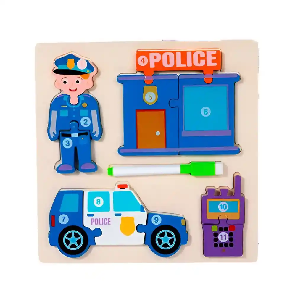 ¡Prepara a tu pequeño para una misión de aprendizaje y diversión con este increíble tablero de actividades 4 en 1! Este juguete de madera de alta calidad invita a los niños a explorar y armar cuatro fascinantes rompecabezas que representan a un valiente profesional junto a su moderno equipo de trabajo, como sus vehículos y herramientas de exploración. Cada pieza está ingeniosamente numerada, permitiendo que los más pequeños practiquen el conteo y la secuencia numérica mientras desarrollan su motricidad fina y habilidades para resolver problemas. Al terminar, la aventura continúa: solo hay que darle la vuelta al tablero para descubrir una pizarra blanca, perfecta para dibujar, practicar letras y dar rienda suelta a la creatividad con el marcador borrable incluido. Es la herramienta todo-en-uno ideal para combinar el pensamiento lógico con la expresión artística en horas de juego inteligente. Ficha Técnica: Dimensiones: 22 cm x 22 cm x 2 cm Material: Madera Edad recomendada: + 3 años Referencia: DM1278 Certificado de conformidad: E5-0359-2021 ** _Para defectos de fábrica o retractos: \_Por favor revise el producto apenas lo reciba y antes de usarlo. No aplican ley de retracto o defectos de fábrica luego de usar el producto. Se manejan máximo 5 días para reportar defectos de fábrica (por ejemplo, producto funciona mal, piezas faltantes, rotas, etc). Para hacer efectiva la devolución el producto debe devolverse con el empaque original, el cual debe estar en buen estado, incluir todos los documentos y las partes completas y sin daños.