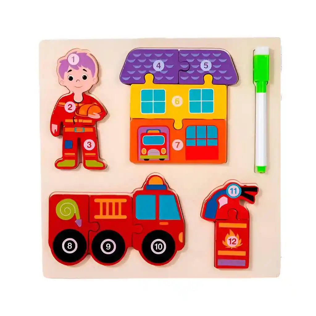 ¡Prepara a tu pequeño para una misión de aprendizaje y diversión con este increíble tablero de actividades 4 en 1! Este juguete de madera de alta calidad invita a los niños a explorar y armar cuatro fascinantes rompecabezas que representan a un valiente profesional junto a su moderno equipo de trabajo, como sus vehículos y herramientas de exploración. Cada pieza está ingeniosamente numerada, permitiendo que los más pequeños practiquen el conteo y la secuencia numérica mientras desarrollan su motricidad fina y habilidades para resolver problemas. Al terminar, la aventura continúa: solo hay que darle la vuelta al tablero para descubrir una pizarra blanca, perfecta para dibujar, practicar letras y dar rienda suelta a la creatividad con el marcador borrable incluido. Es la herramienta todo-en-uno ideal para combinar el pensamiento lógico con la expresión artística en horas de juego inteligente. Ficha Técnica: Dimensiones: 22 cm x 22 cm x 2 cm Material: Madera Edad recomendada: + 3 años Referencia: DM1278 Certificado de conformidad: E5-0359-2021 ** _Para defectos de fábrica o retractos: \_Por favor revise el producto apenas lo reciba y antes de usarlo. No aplican ley de retracto o defectos de fábrica luego de usar el producto. Se manejan máximo 5 días para reportar defectos de fábrica (por ejemplo, producto funciona mal, piezas faltantes, rotas, etc). Para hacer efectiva la devolución el producto debe devolverse con el empaque original, el cual debe estar en buen estado, incluir todos los documentos y las partes completas y sin daños.