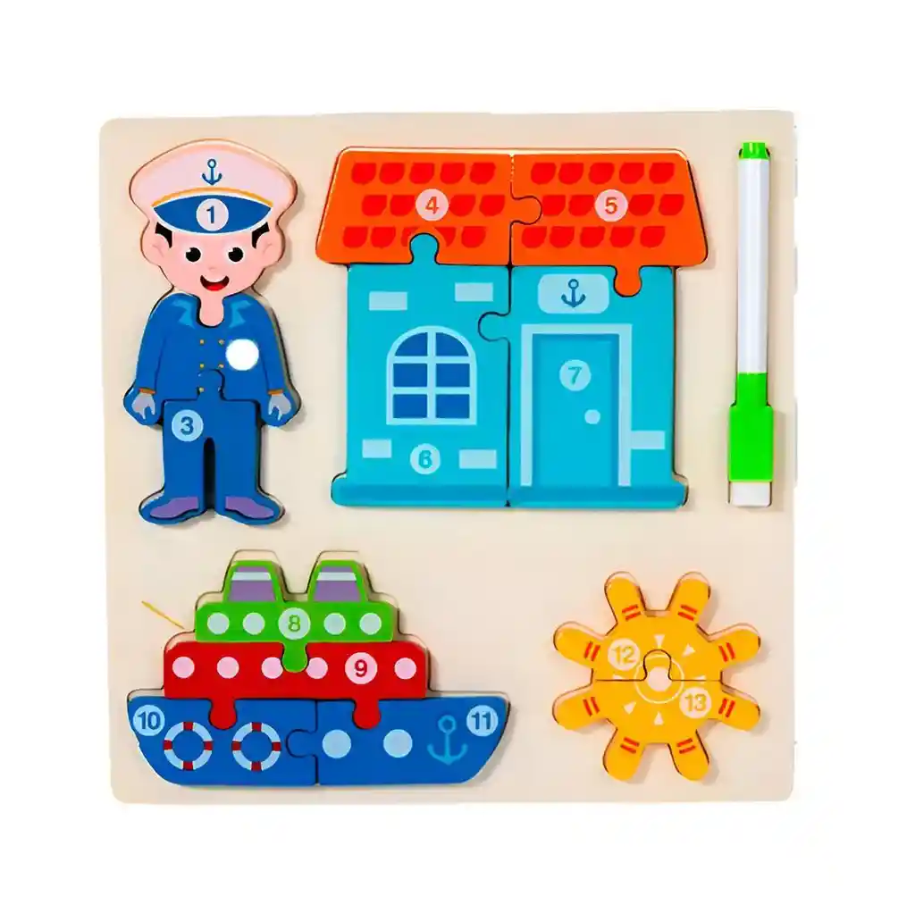 ¡Prepara a tu pequeño para una misión de aprendizaje y diversión con este increíble tablero de actividades 4 en 1! Este juguete de madera de alta calidad invita a los niños a explorar y armar cuatro fascinantes rompecabezas que representan a un valiente profesional junto a su moderno equipo de trabajo, como sus vehículos y herramientas de exploración. Cada pieza está ingeniosamente numerada, permitiendo que los más pequeños practiquen el conteo y la secuencia numérica mientras desarrollan su motricidad fina y habilidades para resolver problemas. Al terminar, la aventura continúa: solo hay que darle la vuelta al tablero para descubrir una pizarra blanca, perfecta para dibujar, practicar letras y dar rienda suelta a la creatividad con el marcador borrable incluido. Es la herramienta todo-en-uno ideal para combinar el pensamiento lógico con la expresión artística en horas de juego inteligente. Ficha Técnica: Dimensiones: 22 cm x 22 cm x 2 cm Material: Madera Edad recomendada: + 3 años Referencia: DM1278 Certificado de conformidad: E5-0359-2021 ** _Para defectos de fábrica o retractos: \_Por favor revise el producto apenas lo reciba y antes de usarlo. No aplican ley de retracto o defectos de fábrica luego de usar el producto. Se manejan máximo 5 días para reportar defectos de fábrica (por ejemplo, producto funciona mal, piezas faltantes, rotas, etc). Para hacer efectiva la devolución el producto debe devolverse con el empaque original, el cual debe estar en buen estado, incluir todos los documentos y las partes completas y sin daños.