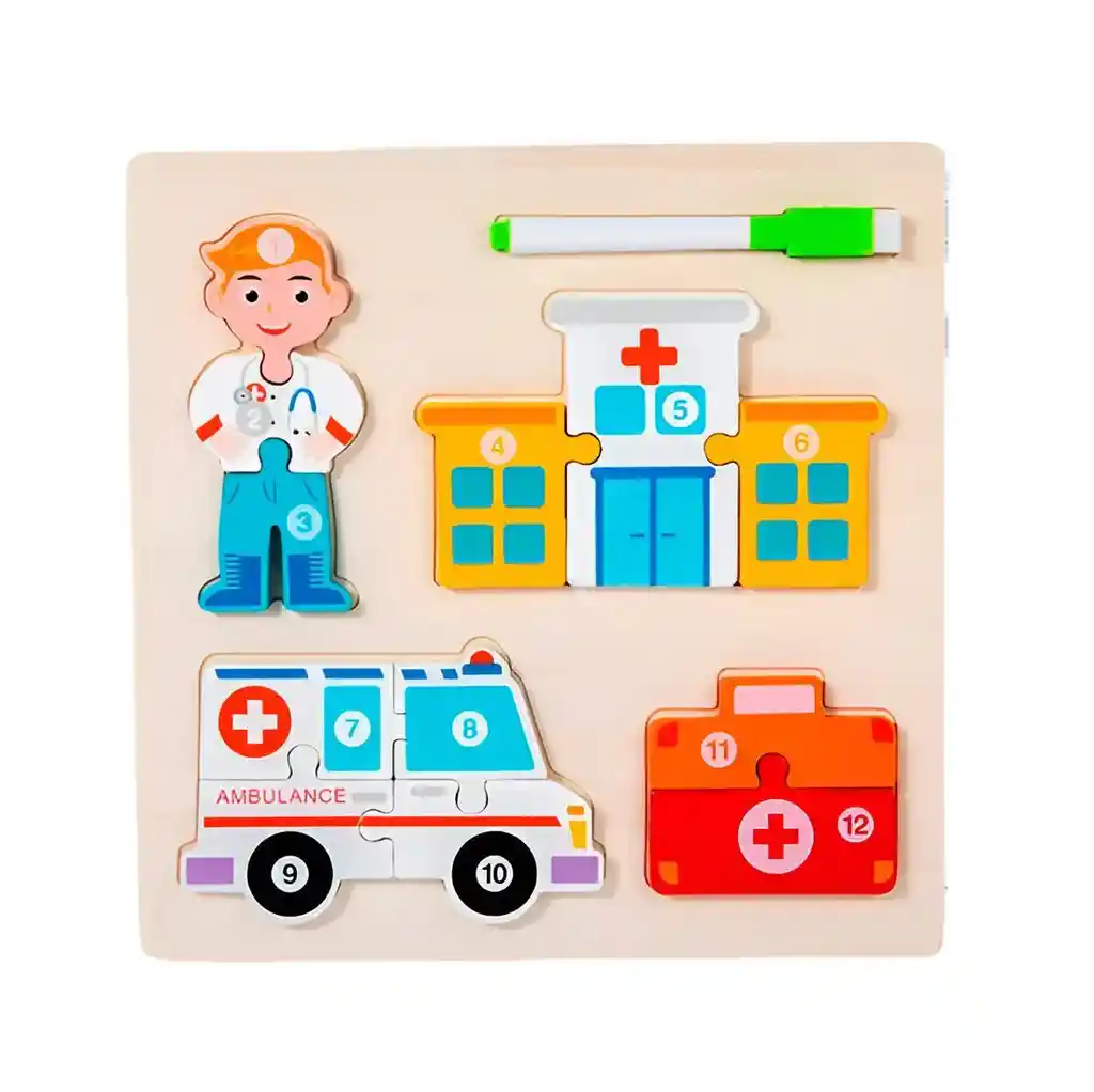 ¡Prepara a tu pequeño para una misión de aprendizaje y diversión con este increíble tablero de actividades 4 en 1! Este juguete de madera de alta calidad invita a los niños a explorar y armar cuatro fascinantes rompecabezas que representan a un valiente profesional junto a su moderno equipo de trabajo, como sus vehículos y herramientas de exploración. Cada pieza está ingeniosamente numerada, permitiendo que los más pequeños practiquen el conteo y la secuencia numérica mientras desarrollan su motricidad fina y habilidades para resolver problemas. Al terminar, la aventura continúa: solo hay que darle la vuelta al tablero para descubrir una pizarra blanca, perfecta para dibujar, practicar letras y dar rienda suelta a la creatividad con el marcador borrable incluido. Es la herramienta todo-en-uno ideal para combinar el pensamiento lógico con la expresión artística en horas de juego inteligente. Ficha Técnica: Dimensiones: 22 cm x 22 cm x 2 cm Material: Madera Edad recomendada: + 3 años Referencia: DM1278 Certificado de conformidad: E5-0359-2021 ** _Para defectos de fábrica o retractos: \_Por favor revise el producto apenas lo reciba y antes de usarlo. No aplican ley de retracto o defectos de fábrica luego de usar el producto. Se manejan máximo 5 días para reportar defectos de fábrica (por ejemplo, producto funciona mal, piezas faltantes, rotas, etc). Para hacer efectiva la devolución el producto debe devolverse con el empaque original, el cual debe estar en buen estado, incluir todos los documentos y las partes completas y sin daños.