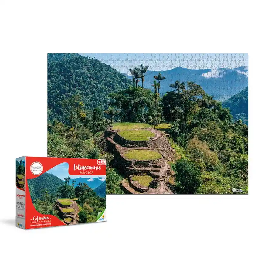"Rompecabezas 1000 fichas edición LATINOAMÉRICA MÁGICA Colombia Ciudad perdida, marca RONDA, tamaño real de la ficha 69 x 48.5 cm. Este es un rompecabezas familiar lleno de mucho color y diversión. "