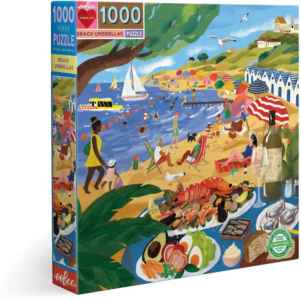 Empaque de regalo sin costo adicional, escríbenos al finalizar la compra. 12 años + El rompecabezas cuadrado de 1000 piezas Un día en la playa da un guiño artístico a los carteles gráficos de viaje de un tiempo anterior. Esta escena del rompecabezas encarna unas vacaciones perfectas junto al mar: casi se puede sentir la arena entre los dedos de los pies y oler el aire del océano. Los detalles incluyen coloridos sombrillas de playa, un campo verde, actividades acuáticas y comida fresca con la captura del día frente a usted. A seguir, por supuesto, por una larga siesta! Ilustrado por Lucia Calfapietra. Nuestros rompecabezas de 1.000 piezas están cuidadosamente encargados y bellamente diseñados para ofrecer una forma relajante y libre de pantalla de practicar la atención plena contemplativa o compartir una actividad cooperativa suave con amigos y familiares.