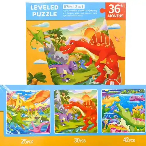 Los rompecabezas son juegos de armado que consisten en piezas encajables que, al unirse correctamente, forman una imagen completa. Son una excelente herramienta lúdica que combina entretenimiento con aprendizaje, promoviendo el desarrollo cognitivo, la concentración y la motricidad fina en niños y niñas. Estos rompecabezas destacan por ser muy coloridos y con diseños alegres, ideales para captar la atención de los más pequeños y mantenerlos motivados durante el juego. Rompecabezas 3 en 1 plegable – 97 piezas: una opción única con tres rompecabezas en un solo empaque, con ilustraciones de dinosaurios. Cada panel contiene una cantidad distinta de piezas (25, 30 y 42 piezas), ideal para acompañar el progreso del niño en sus habilidades de armado. Su formato en pasta dura plegable facilita el almacenamiento y transporte.