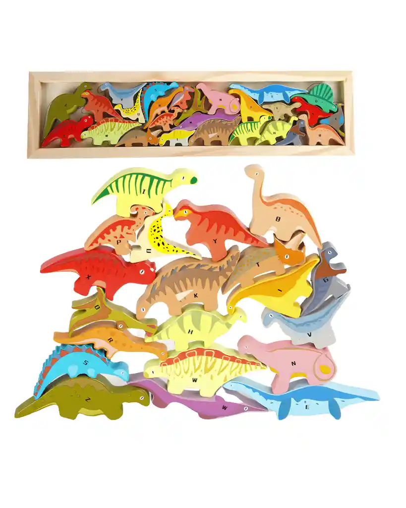 Un juguete educativo y divertido que combina el mundo de los dinosaurios con el aprendizaje del abecedario. - Incluye: piezas de dinosaurios coloridas de la A a la Z. - Material resistente: madera de alta calidad, segura para niños. - Dos formas de juego: ordenar en la bandeja o apilar en forma de pirámide. - Beneficios: desarrolla motricidad fina, coordinación, memoria y reconocimiento de letras. - Edad recomendada: ideal para niños en etapa preescolar y primaria.