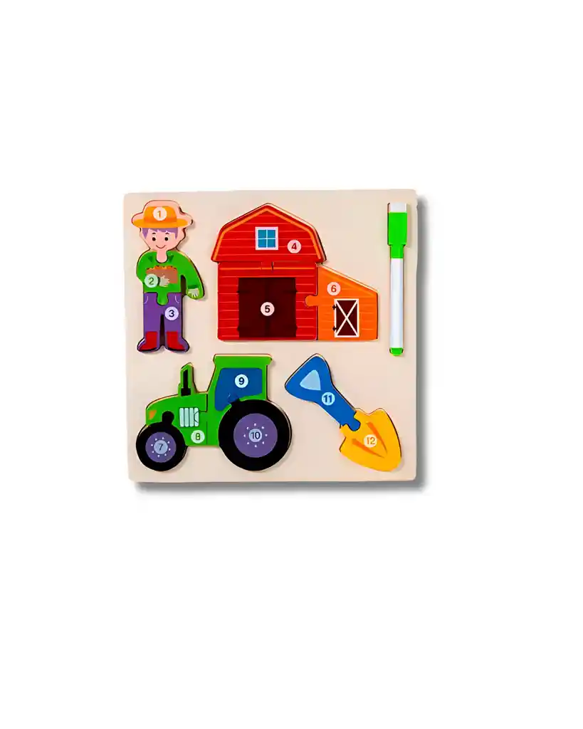 Rompecabezas de madera con piezas grandes y coloridas para que los niños armen: 👨🌾 Un granjero 🏠 Un establo/granero 🚜 Un tractor 🛠 Una pala de granja Incluye marcador borrable ✍ para jugar y aprender. Características: ✅ Hecho en madera resistente y segura. ✅ Piezas grandes y fáciles de manipular. ✅ Colores vivos y atractivos.