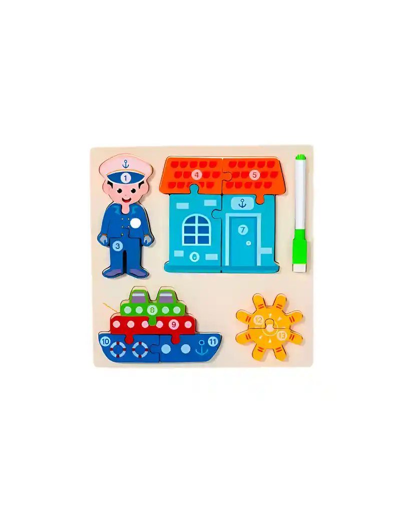 Rompecabezas de madera con piezas grandes y coloridas para que los niños armen: 👨✈ Un marinero 🏠 Una casita 🚗 Un auto 🚢 Un barco ⚙ Un timón de barco Incluye marcador borrable ✍ para acompañar el juego. Características: ✅ Material resistente: madera ecológica. ✅ Piezas grandes, fáciles de manipular. ✅ Colores vivos que atraen la atención.