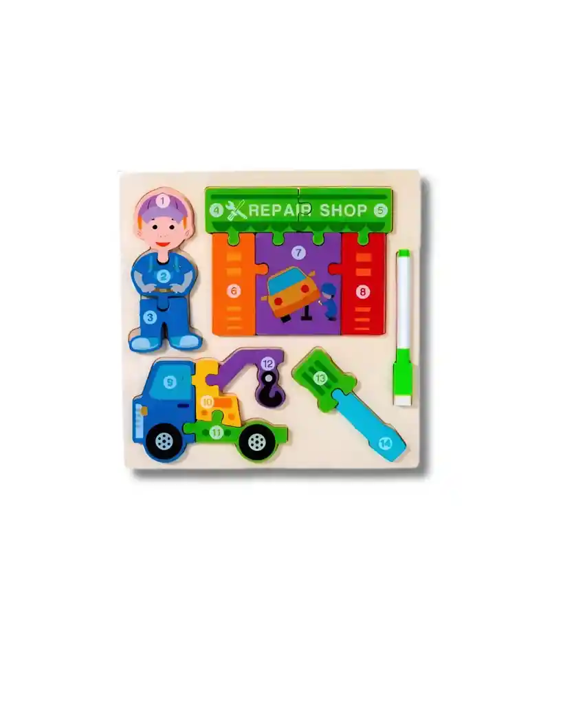 👨🔧 Un mecánico 🏠 Un taller con letrero “Repair Shop” 🚗 Un auto en reparación 🚛 Una grúa de rescate 🔑 Una llave inglesa Incluye marcador borrable ✍ para acompañar el juego. Características: ✅ Hecho en madera resistente. ✅ Piezas grandes, fáciles de manipular. ✅ Colores vivos que atraen la atención