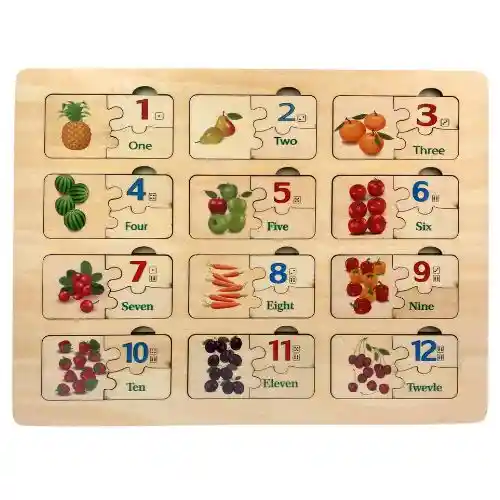 Los rompecabezas didácticos de madera son juegos ideales para estimular el aprendizaje temprano en los niños, combinando diversión, exploración y desarrollo cognitivo. Se diferencian de los rompecabezas comunes por incorporar elementos pedagógicos, como colores llamativos, numeraciones, palabras en inglés, y temáticas educativas, lo que los convierte en una herramienta útil tanto en el hogar como en entornos escolares. Material resistente: Elaborados en madera natural, ofrecen durabilidad y resistencia frente al uso constante. Este modelo combina imágenes de frutas con fichas de números en inglés y en formato numérico. Permite al niño asociar cantidades visuales con su representación numérica y lingüística, reforzando el razonamiento lógico y el vocabulario en otro idioma.