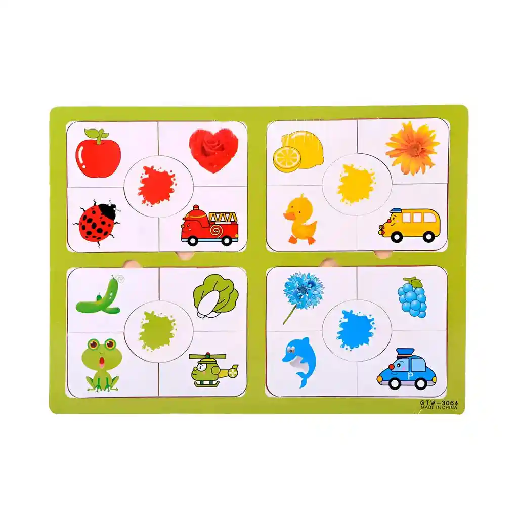 ¡Inicia un emocionante viaje de descubrimiento y color con este encantador rompecabezas educativo de madera! Especialmente diseñado para las mentes más curiosas de la casa, este tablero 4 en 1 es la herramienta perfecta para introducir a los pequeños al mundo de la asociación lógica y los colores. Tu hijo se divertirá por horas mientras empareja las vibrantes ilustraciones de animales, frutas y vehículos con su color correspondiente —rojo, amarillo, verde y azul—, desarrollando habilidades clave como el reconocimiento de objetos, la ampliación de su vocabulario y la motricidad fina al manipular cada pieza. Fabricado con materiales duraderos y seguros, este juego no solo entretiene, sino que sienta las bases del aprendizaje temprano, convirtiendo cada momento de juego en una valiosa oportunidad para crecer y explorar. Ficha Técnica: Dimensiones : 30 cm x 22 cm x 1 cm Material: Madera Edad apta + 3 años Certificado de conformidad: SL-CS-210044 Referencia: DM541 ** _Para defectos de fábrica o retractos: \_Por favor revise el producto apenas lo reciba y antes de usarlo. No aplican ley de retracto o defectos de fábrica luego de usar el producto. Se manejan máximo 5 días para reportar defectos de fábrica (por ejemplo, producto funciona mal, piezas faltantes, rotas, etc). Para hacer efectiva la devolución el producto debe devolverse con el empaque original, el cual debe estar en buen estado, incluir todos los documentos y las partes completas y sin daños.