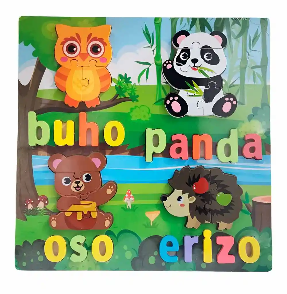 Rompecabezas de madera con tiernos animales como panda, búho, erizo y oso, acompañado de sus nombres en letras de colores para que los niños puedan asociar palabra e imagen; ideal para estimular el aprendizaje del vocabulario, la memoria, la motricidad fina y la coordinación mientras se divierten armando y reconociendo a cada personaje del bosque. Ficha Técnica: Materiales : Madera Dimensiones: 30 cm x 30 cm x 1 cm Edad recomendada : + 3 años en adelante Material suave, cómodo, seguro, no tóxico Certificado de conformidad: SL-CS-210044 Referencia: CNS-036 Términos de garantía: Para defectos de fábrica o retractos: Por favor revise el producto apenas lo reciba y antes de usarlo. No aplican ley de retracto o defectos de fábrica luego de usar el producto. Se manejan máximo 5 días para reportar defectos de fábrica (por ejemplo, producto funciona mal, piezas faltantes, rotas, etc). Para hacer efectiva la devolución el producto debe devolverse con el empaque original, el cual debe estar en buen estado, incluir todos los documentos y las partes completas y sin daños.