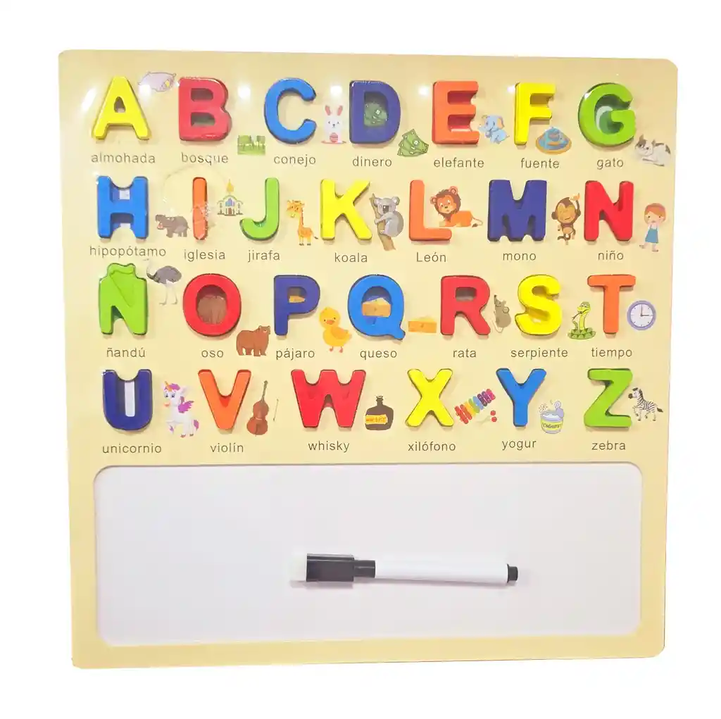 Este rompecabezas de encastre es perfecto para que los niños aprendan el abecedario mientras desarrollan sus habilidades motrices. Cada letra encastra en su lugar correspondiente junto a coloridas figuras con sus nombres, facilitando la asociación entre palabras e imágenes. Además, incluye un tablero de fácil rayado y limpieza, ideal para escribir, dibujar y borrar, ofreciendo múltiples formas de jugar y aprender de manera divertida e interactiva. Ficha Técnica: Dimensiones: 30 cm x 30 cm Material: Madera Edad recomendada + 3 Años Certificado de conformidad: SL-CS-210044 Referencia: DM1264 ** _Para defectos de fábrica o retractos: \_Por favor revise el producto apenas lo reciba y antes de usarlo. No aplican ley de retracto o defectos de fábrica luego de usar el producto. Se manejan máximo 5 días para reportar defectos de fábrica (por ejemplo, producto funciona mal, piezas faltantes, rotas, etc). Para hacer efectiva la devolución el producto debe devolverse con el empaque original, el cual debe estar en buen estado, incluir todos los documentos y las partes completas y sin daños.