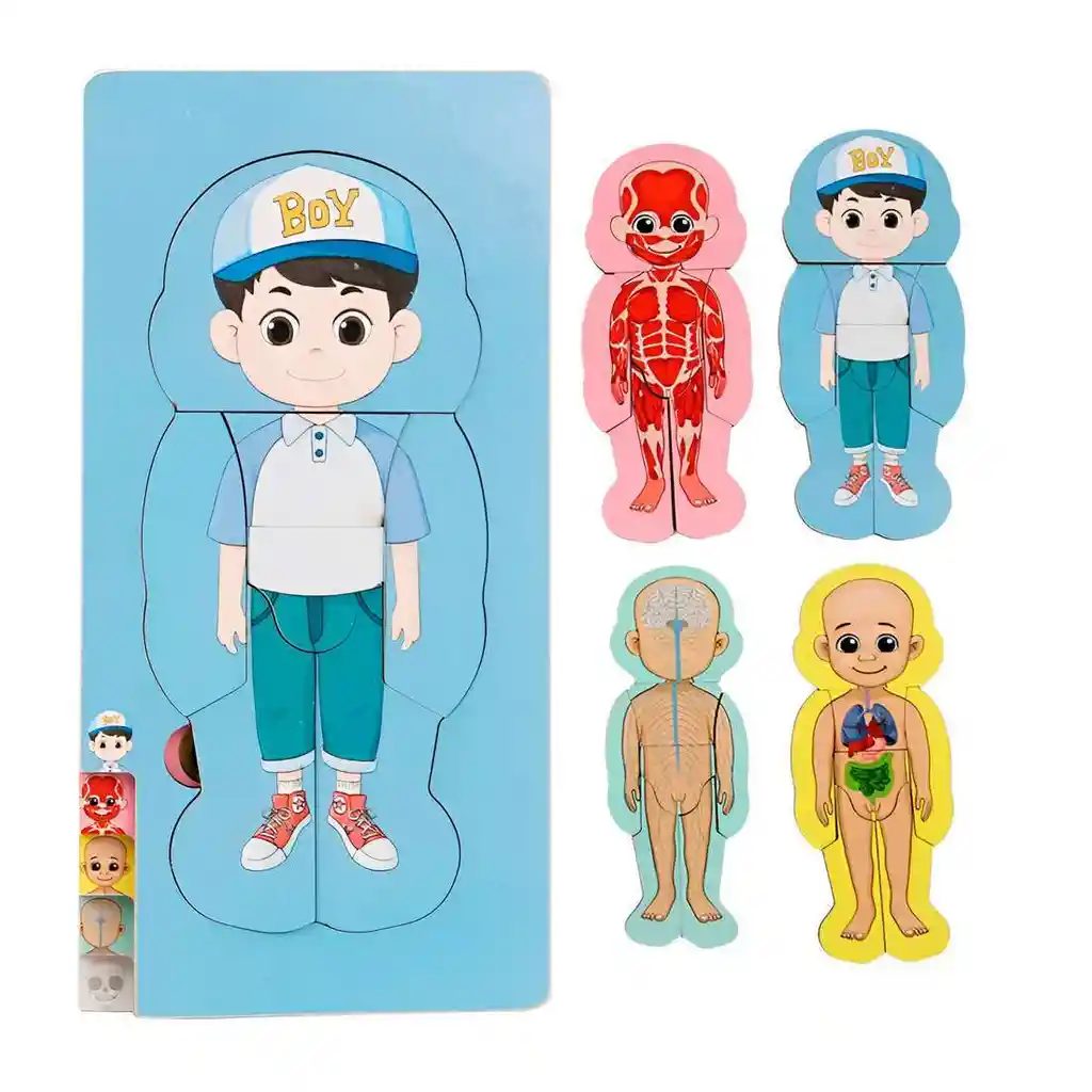 Embárcate en un fascinante viaje de descubrimiento con este innovador rompecabezas de madera de múltiples capas sobre el cuerpo humano. Diseñado para pequeños exploradores curiosos, este juguete educativo permite a los niños aprender sobre anatomía de una manera interactiva y visualmente atractiva, montando capa por capa desde el esqueleto, pasando por los órganos vitales y los músculos, hasta llegar a la figura completamente vestida. Cada pieza, fabricada con materiales de alta calidad y un tamaño perfecto para manos pequeñas, no solo enseña los fundamentos de la biología de forma sencilla, sino que también fortalece la motricidad fina, la resolución de problemas y el pensamiento lógico. Es la herramienta de aprendizaje perfecta para convertir la ciencia en un juego apasionante y responder a la pregunta de "¿qué hay dentro de nosotros?" de la forma más divertida posible. Ficha Técnica: Dimensiones: 19.5 cm x 9.5 cm x 2 cm Material: Madera Edad recomendada: + 3 años Referencia: DM1344 Certificado de conformidad: E5-0359-2021 ** _Para defectos de fábrica o retractos: \_Por favor revise el producto apenas lo reciba y antes de usarlo. No aplican ley de retracto o defectos de fábrica luego de usar el producto. Se manejan máximo 5 días para reportar defectos de fábrica (por ejemplo, producto funciona mal, piezas faltantes, rotas, etc). Para hacer efectiva la devolución el producto debe devolverse con el empaque original, el cual debe estar en buen estado, incluir todos los documentos y las partes completas y sin daños.