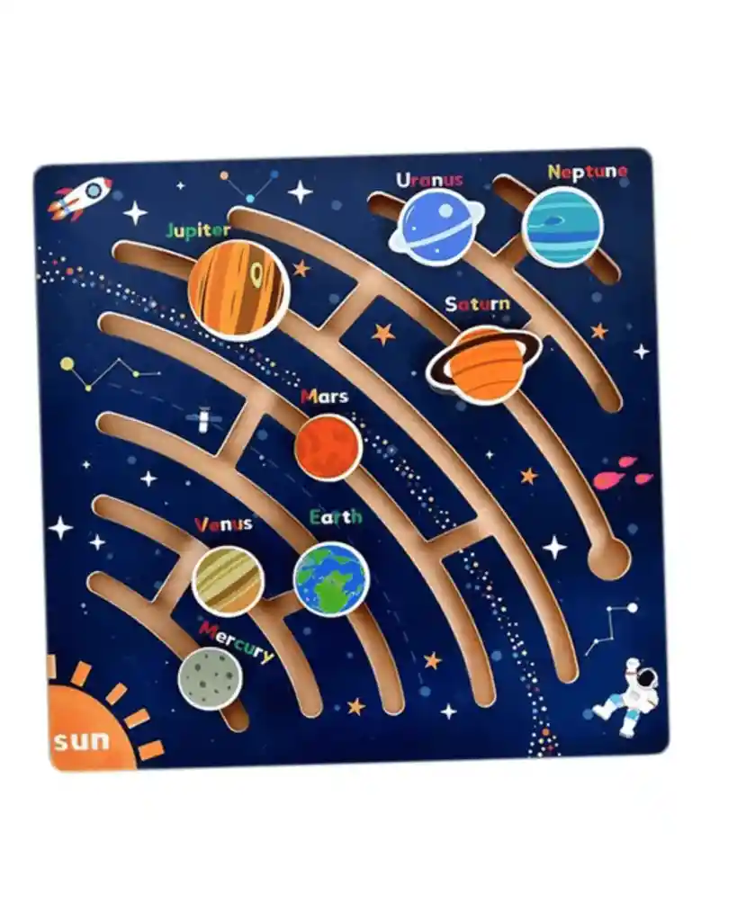 Rompecabezas de madera del Sistema Solar 🪐🌞. Los niños aprenden los planetas mientras juegan. Motricidad y diversión Tablero de madera con ilustraciones de los planetas y el Sol. Incluye piezas móviles de cada planeta que se deslizan a través de las órbitas en forma de laberinto. Beneficios para el niño: 🌍 Aprende los nombres y posiciones de los planetas de forma divertida. 🧩 Desarrolla coordinación mano-ojo y motricidad fina. 🚀 Estimula la curiosidad por el espacio y la astronomía.