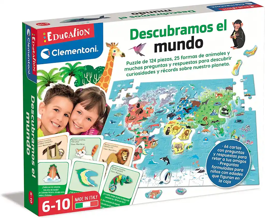 Empaque de regalo sin costo adicional, escríbenos al finalizar la compra. 6 años + ¡Bienvenidos al increíble juego "Descubre los animales del mundo"! Este emocionante juego en línea es perfecto para aquellos que desean explorar y aprender sobre los fascinantes animales que habitan nuestro planeta. Con un puzle de 124 piezas que representa un planisferio con características físicas destacadas, este juego ofrece una experiencia educativa única. El juego cuenta con 25 formas de animales diferentes que deberás encajar en los hábitats correspondientes. A medida que los jugadores completan el puzle, podrán descubrir y aprender los nombres y la clasificación de los animales. Además, el juego incluye 66 cartas con preguntas y respuestas relacionadas con los animales, lo que brinda aún más oportunidades para aprender y poner a prueba tus conocimientos. El completo manual de instrucciones proporciona diferentes modalidades de juego sugeridas, lo que permite a los jugadores explorar el mundo animal de diversas formas. Además, el juego incluye tarjetas de información que ayudan a clasificar los animales según sus características y hábitats. Inspirado en el plan de estudios inspirado en Montessori, con piezas de rompecabezas de autocorrección que tienen pistas de colores y motiva el aprendizaje autodirigido. Hecho en Italia. Todas las piezas están construidas con cartón laminado de alta calidad; y está hecho para soportar las caídas del juego diario. Tamaño: 37 x 28 x 5cm