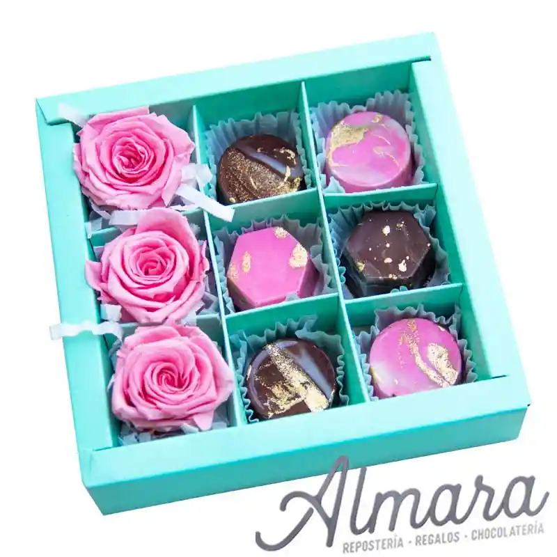 1 Caja plegada con tapa acetato medidas 13*13cm, decorado con lazo de tela 6 Bombones rellenos de ganache de frutos rojos y de nutella 3 Rosas mini naturales preservada Almara,chocolates, mujer, desayunos, algos, anchetas