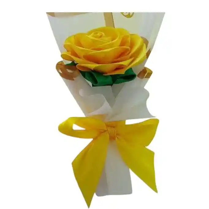 Bouquet de una rosa amarilla eterna en tela, elaborada a mano, con papel y moño