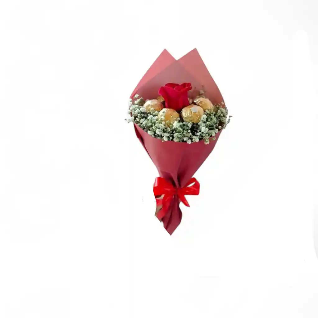 Rosa roja acompañada de 4 chocolates ferrero rocher envoltura en papel coreano y laso decorativo incluye tarjeta.