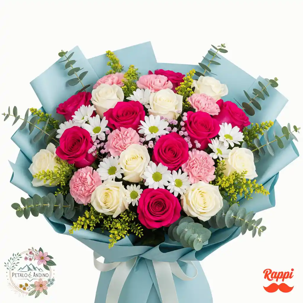 En Pétalo Andino queremos que tus flores sean las más frescas y hermosas. Para asegurar la mejor calidad, te sugerimos hacer tu pedido con al menos un día de anticipación. ¡Así garantizamos que recibirás la mejor selección y presentación en tu arreglo floral! Descripción: 8 rosas fucsias 8 rosas blancas 6 margaritas blancas 6 claveles rosados 3 ramitas de solidago 4 ramas de eucalipto
