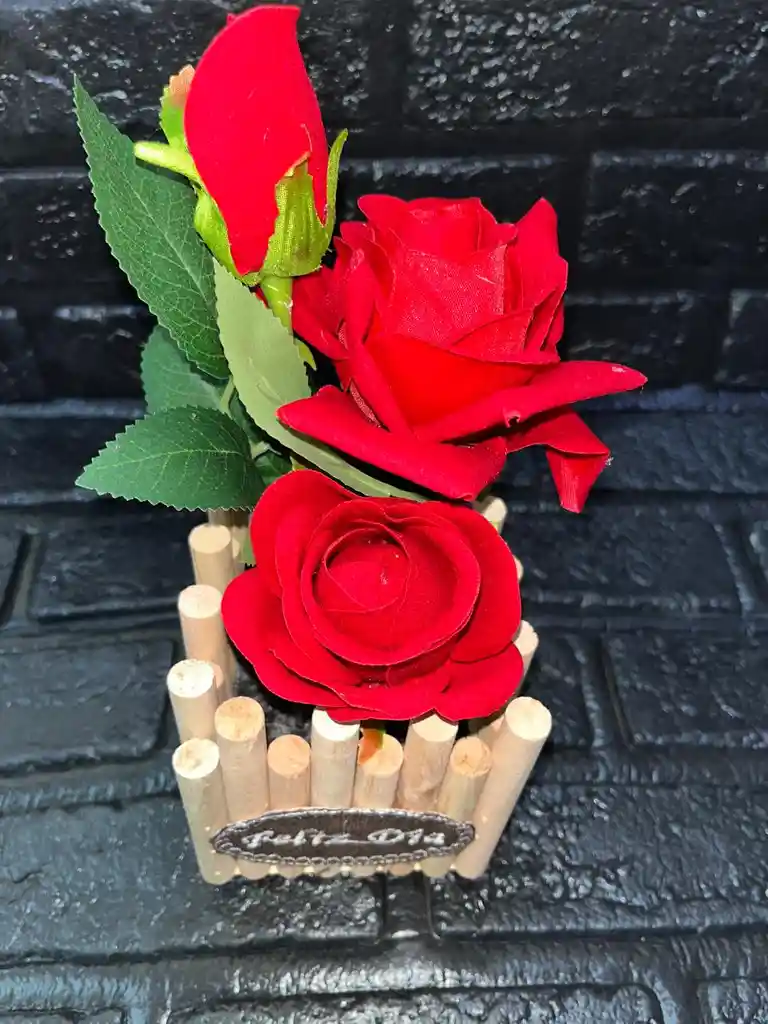 Rosa con matera de madera 20 cm alto
