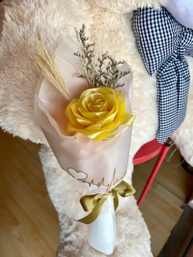 Obsequia esta hermosa rosa eterna elaborada con cinta de seda, acompañada de follajes secos que la hacen lucir como un detalle hermoso y único. Incluye empaque tipo coreano y tarjeta DE - PARA. **Disponible en rosado y amarillo, te puede llegar cualquiera de los dos colores disponibles.