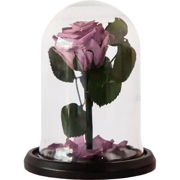 Arreglo floral con Urna de vidrio y base en madera color wengue, en su interior una rosa estándar natural preservada, 6cm diámetro que perdura intacta por meses, decorada con pétalos de rosa. Color a elección.Viene en Bolsa de lujo e Incluye tarjeta