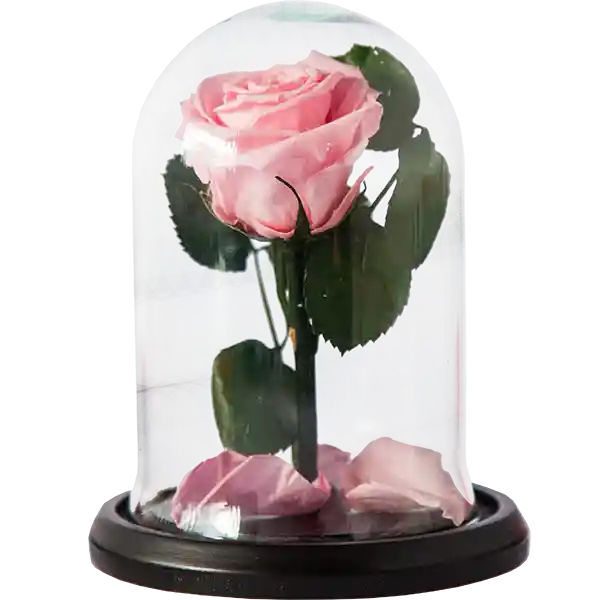 Arreglo floral con Urna de vidrio y base en madera color wengue, en su interior una rosa estándar natural preservada, 6cm diámetro que perdura intacta por meses, decorada con pétalos de rosa. Color a elección.Viene en Bolsa de lujo e Incluye tarjeta