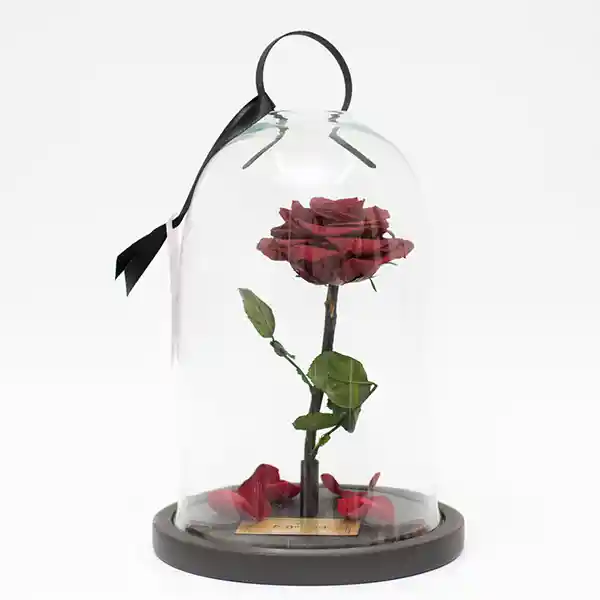Inspirados en la magia de Disney traemos para ti la Rosa Encantada del clásico La Bella y la Bestia. Una hermosa rosa preservada Premium dentro de una urna en vidrio con base de madera, pétalos caídos y un herraje en la parte superior de la urna.