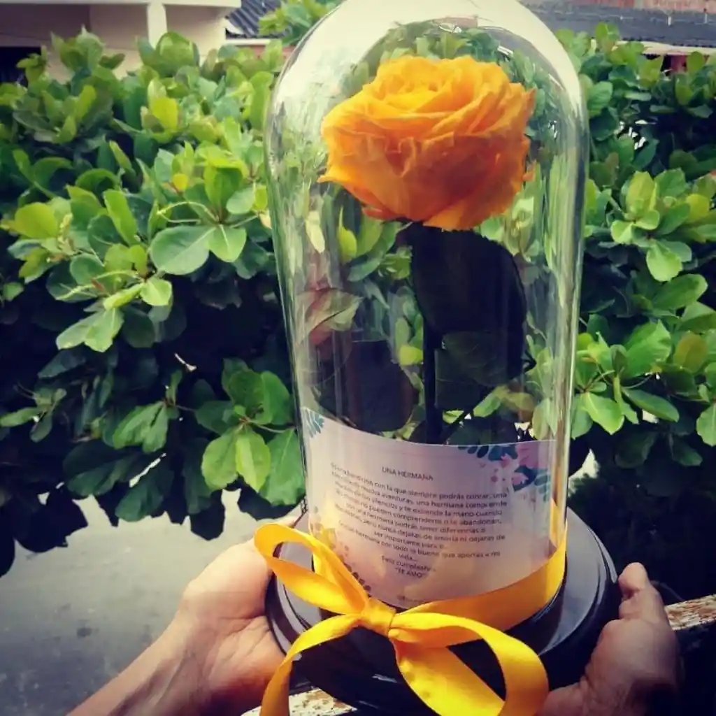 Rosa amarilla preservada con flores conservadas rosas reales en cúpula de cristal y base de madera