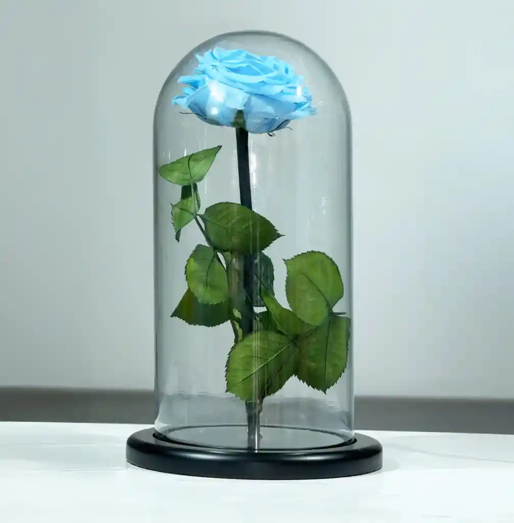 Rosa azul preservada dentro de una elegante cúpula de cristal con base de madera. Un símbolo de misterio y confianza, perfecta para un regalo único e inolvidable.