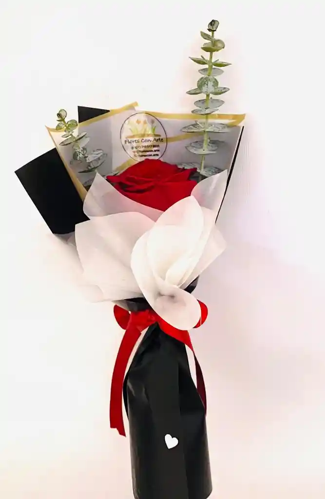 majestuosa rosa de color rojo con eucalipto en buque con papel coreano
