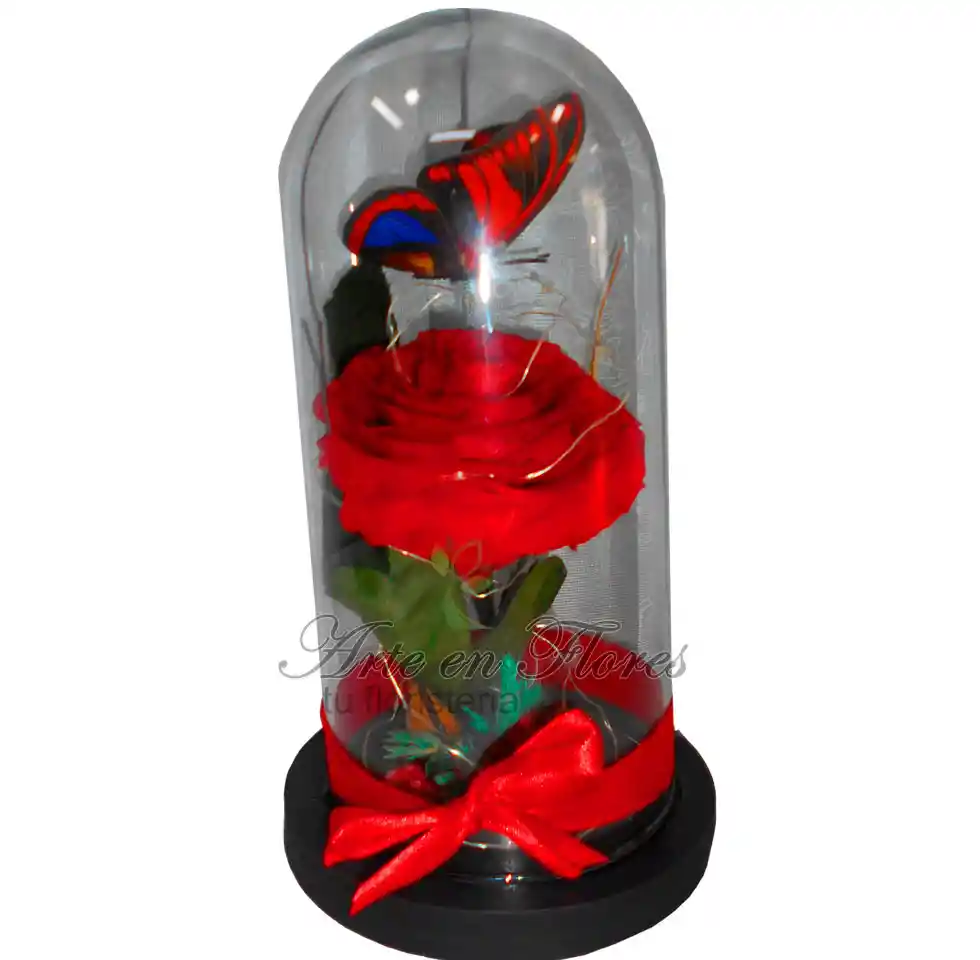 Este arreglo esta elaborado con: Rosa Inmortalizada Roja ( Esta flor tiene una duración de 4 a 5 años) Mariposa artificial Luces Moño Urna Decoración