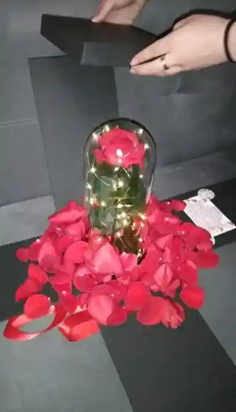 hermosa rosa natural, preservada o eterna, con cupula de critsal, base en madera, caja sorpresa, moño decorativo, y luces Led.