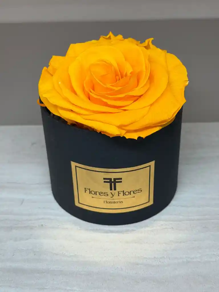 Rosa preservada amarilla, en cajita de lujo, duración de más de dos años. Incluye tarjeta personalizada y tarjeta con cuidados.