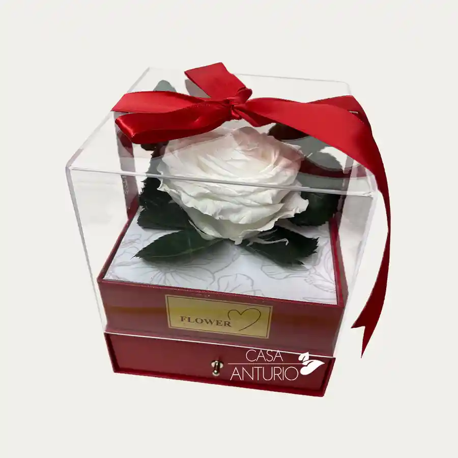 Rosa natural preservada que ha pasado por un proceso especial para conservar su belleza hasta por 5 años. Presentada en un elegante cofre joyero (14 cm x 16 cm), es un regalo sofisticado, elegante y duradero.