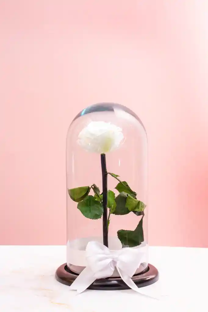 Imagina una rosa preservada en un vibrante color blanco. Su tono es intenso y llamativo, capturando la mirada con su belleza singular. Los pétalos suaves y delicados parecen congelados en el tiempo, conservando toda su frescura y forma natural. La rosa está inmersa en un estado de eterna gracia, emanando una sensación de elegancia y sofisticación. Su color resalta en cualquier entorno, añadiendo un toque de alegría y encanto a cualquier espacio donde se encuentre. Esta rosa preservada tiene un tiempo de durabilidad de 4 a 5 años, despues de este tiempo sus petalos se empezaran a caer de manera natural.