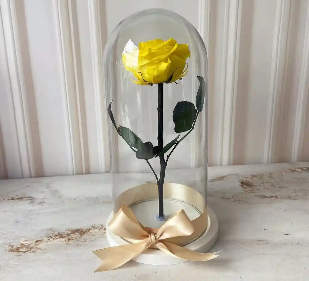 Rosa preservada (color según disponibilidad) en cúpula de vidrio con lazo en tela y tarjeta dedicatoria.