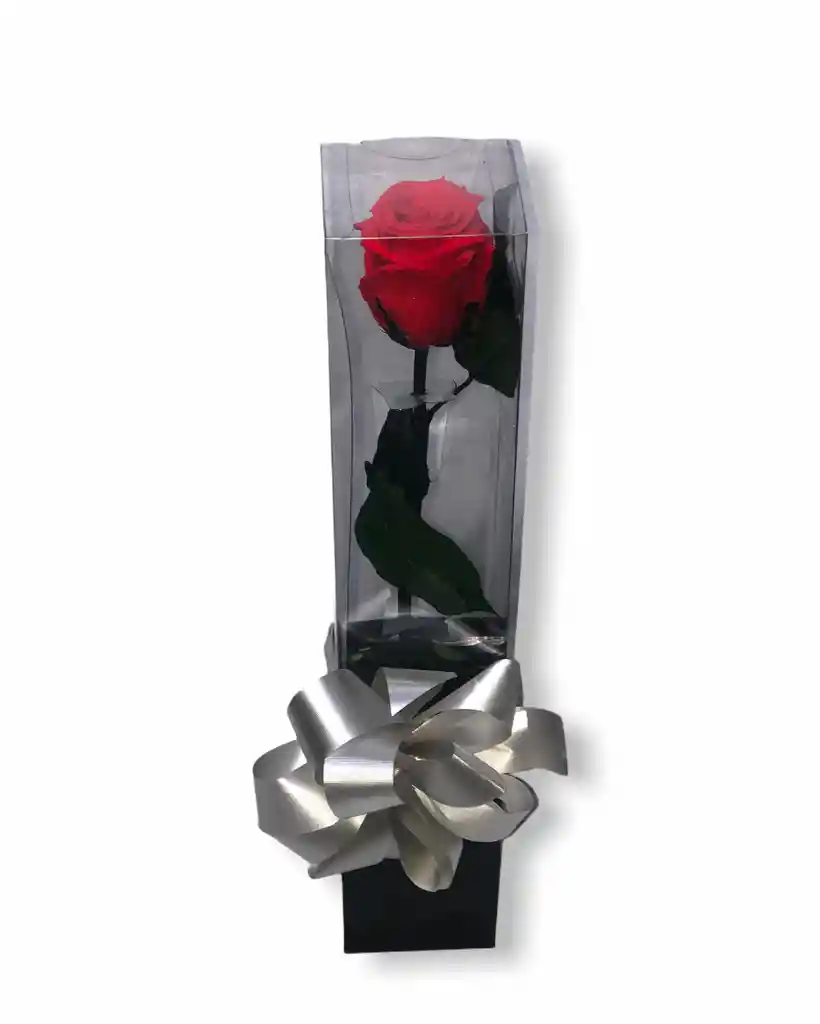 Rosa Preservada Roja completamente natural, la inmortalización conservar la frescura y belleza de las flores vivas durante años. Empaque de lujo en acetato con moño y tarjeta personalizada. Dimensiones 50cm x 7cm x 7cm