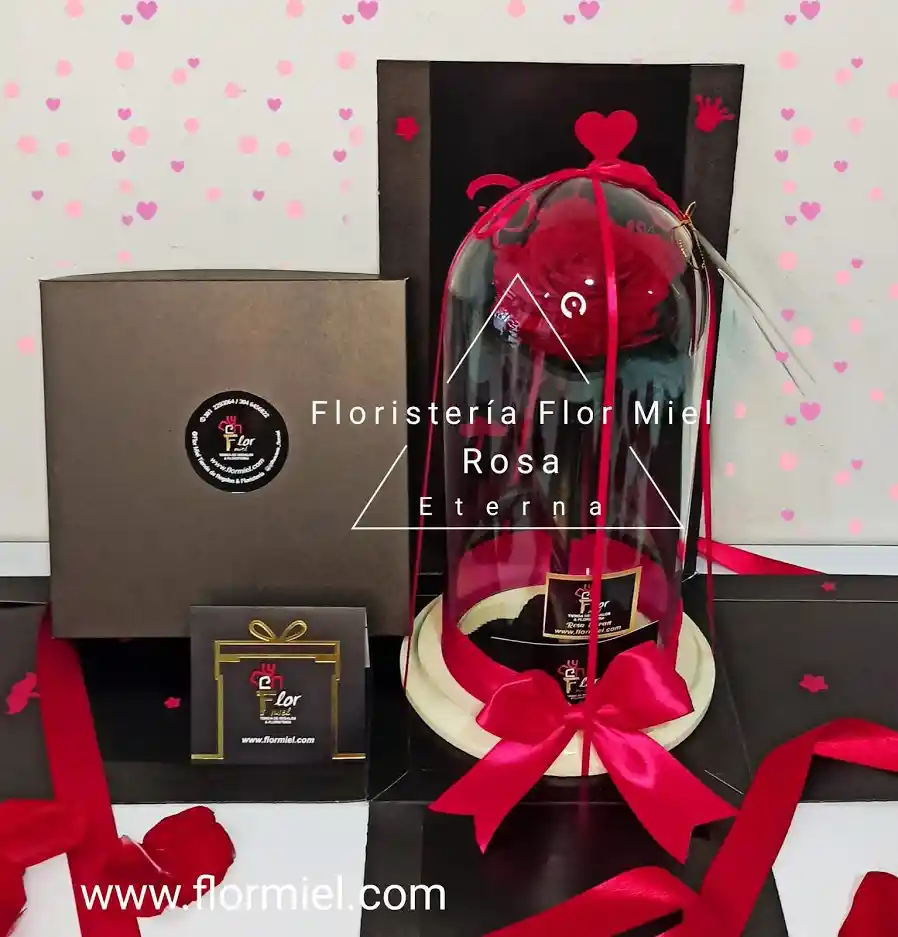 Rosas Preservadas Que duran de dos a tres años, van en dentro del cristal y se les obsequia la caja, la caja puede ir negra o blanca según disponibilidad y se les marca de acuerdo a la ocasión. Lleva moño y tarjeta.