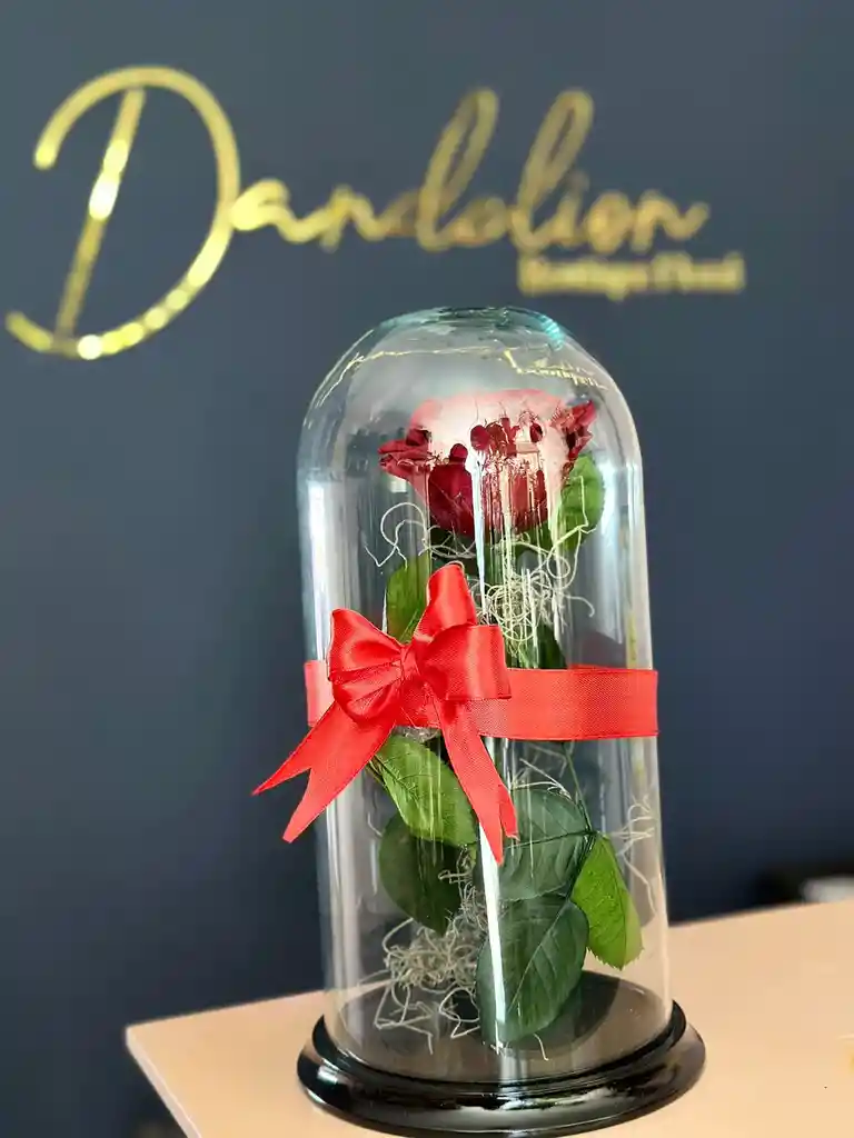 Hermoso detalle que contiene: Rosa Preservada color rojo en tamaño tipo exportación Vida entre 1 y 4 años Incluye toda la decoración y empaque Cúpula de cristal