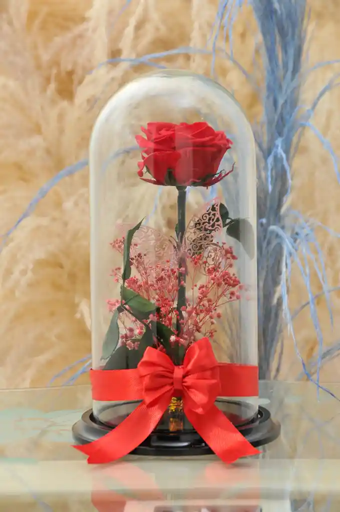 rosa preservada roja en cupula de cristal de 55 cmts decorada 5 años de duración