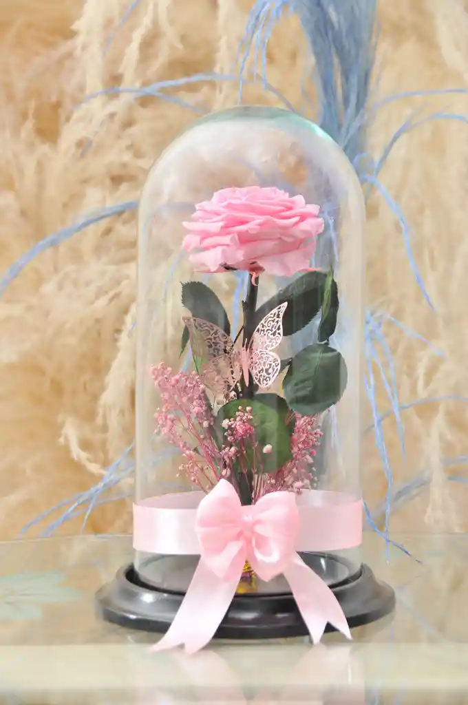 rosa preservada color rosado decorada en cupula de cristal 55 cmts duración 5 años