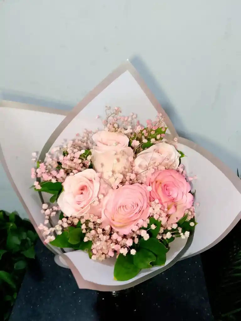 Arreglo de rosas rosadas elaborado con papel coreano y follaje