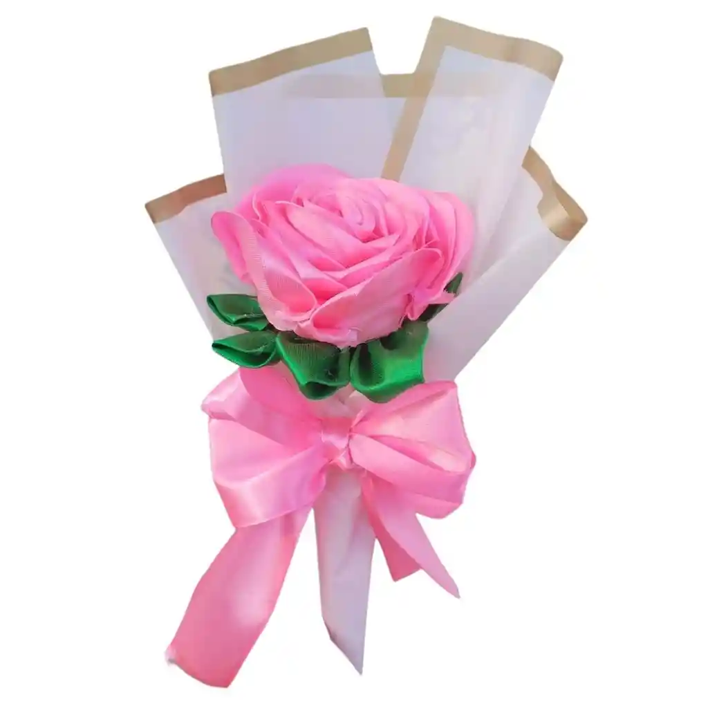 Bouquet de una rosa rosada eterna en tela, elaborada a mano, con papel y moño