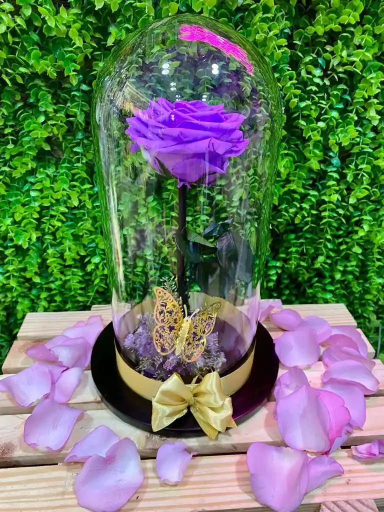 Rosa en cupula de vidrio con tapa de madera, Rosa preservada de colores basicos. con piso de flores preservadas