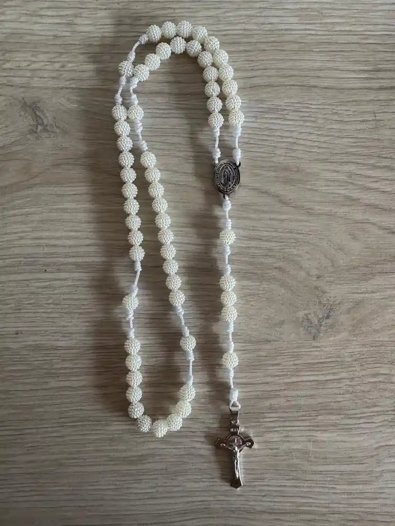 Este rosario es una pieza elaborada con delicadas cuentas tejidas en tono marfil, un diseño elegante y sobrio que inspira paz y recogimiento. Cada cuenta presenta una textura detallada que realza su belleza, acompañada por un crucifijo metálico plateado que añade un toque de brillo y devoción. Ideal para oración diaria, regalo significativo o acompañar momentos espirituales. ⭐ Características del producto Cuentas trabajadas con acabado esférico texturizado Color marfil/crema: neutro, elegante y combinable Crucifijo metálico plateado de diseño clásico en acero inoxidable Peso ligero y cómodo para rezar o llevar consigo Incluye medalla central metálica 🎁 Ideal para: ✨ Regalo espiritual ✨ Primera Comunión, Bautizo, Confirmación ✨ Uso personal diario de oración