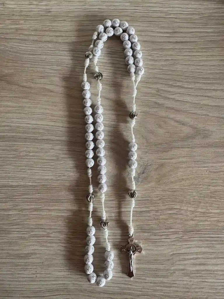 Este rosario combina lo clásico con un toque moderno: cuentas blancas grabadas, separadores metálicos que dan un acento sofisticado y un crucifijo plateado de estilo tradicional. Es resistente, ligero y visualmente muy atractivo. Una excelente opción para uso diario, regalos religiosos o para llevar siempre contigo como símbolo de fe.