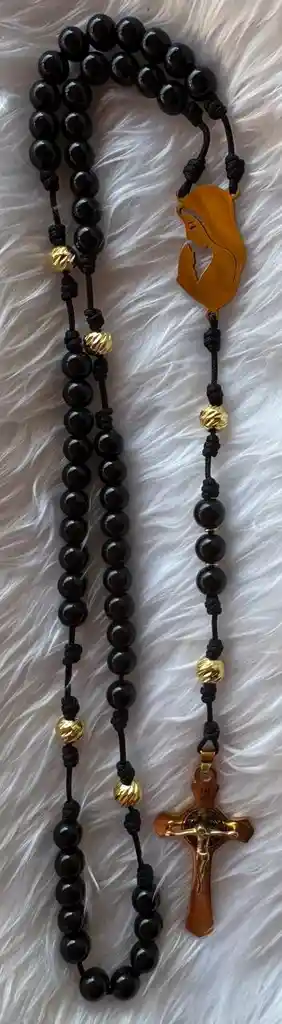 Un rosario clásico, sobrio y profundamente significativo. Está elaborado con cuentas negras brillantes, enlazadas a mano con resistente cordón negro, decorado con detalles dorados que añaden un toque elegante. En el centro lleva una hermosa medalla de la Divina Misericordia, perfecta para acompañarte en tus momentos de oración y reflexión. Finaliza con un crucifijo metálico detallado, firme y de excelente calidad. Ideal para uso diario, regalos espirituales, protección personal o acompañar tu altar en casa. ✨ Características: Cuentas negras tipo perla, de acabado brillante. Medalla central dorada en acero inoxidable de la Divina Misericordia Crucifijo metálico resistente y elegante en acero inoxidable Misterios distinguidos con perlas de rodio Ensamblado a mano con cordón reforzado. Producto ideal para devoción, oración y obsequio.