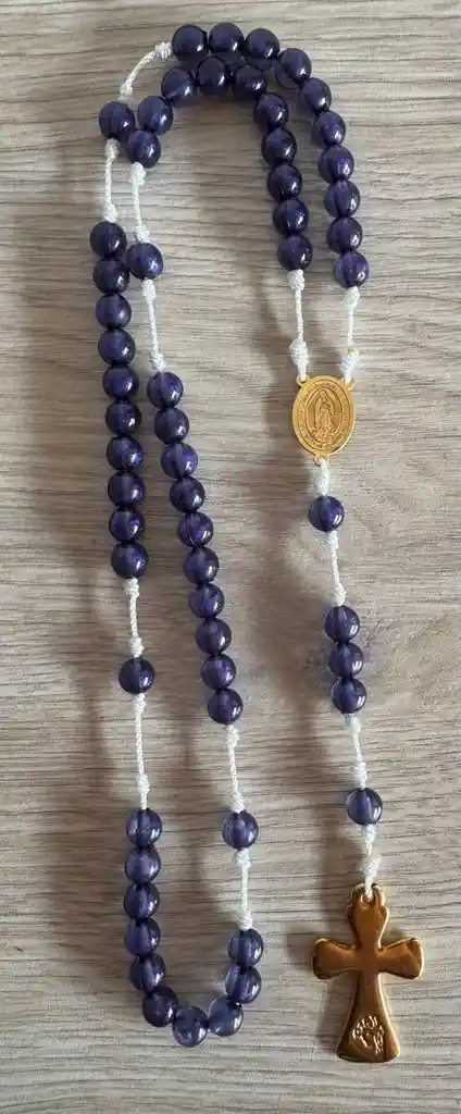 Este hermoso rosario de cuentas moradas combina elegancia y espiritualidad en una pieza única. Sus cuentas brillantes simbolizan la fe y la reflexión, unidas por un resistente hilo blanco que resalta su diseño artesanal. El centro presenta una medalla dorada con la Virgen, y una cruz dorada que representa luz, esperanza y protección divina. Perfecto para acompañarte en la oración, para regalar o como símbolo de devoción personal. ✨ Presentación: bolsita transparente que permite apreciar su belleza. • Material: acrílico resistente e hilo blanco • Color: morado con detalles dorados • Uso: oración, devoción, regalo espiritual • Hecho con amor por Arte de Fe