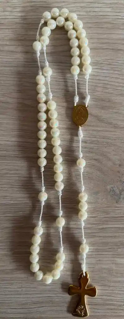 Un rosario diseñado para quienes buscan conexión, luz y calma espiritual. Elaborado con cuentas perladas iridiscentes que reflejan la luz suavemente, incluye una medalla dorada con la imagen de la Virgen y una cruz delicadamente tallada. Ideal para oración diaria, acompañar momentos especiales o como regalo lleno de intención y bendición. ✔ Hecho a mano ✔ Material duradero y ligero ✔ Detalles dorados que elevan su presencia ✔ Perfecto para devoción, regalo o acompañamiento espiritual Un artículo devocional que no solo se lleva, sino que se siente.