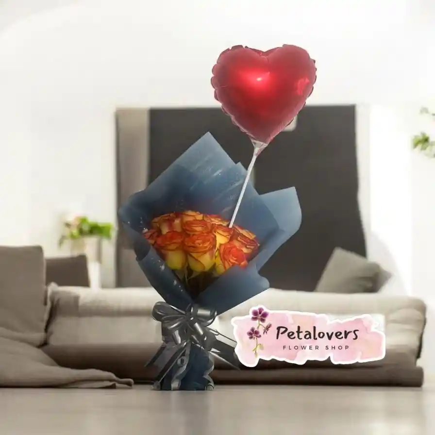 Arreglo encantador de 12 rosas acompañadas de globo, un detalle romántico y alegre que combina la elegancia de...Ver más